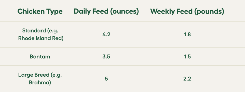 - Feed each standard chicken about 4.2 ounces (120 grams) per day