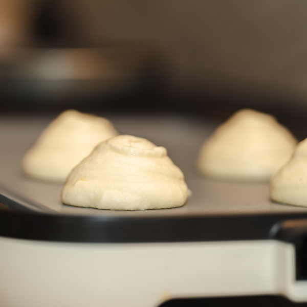 • Heat the pan to low to medium-low heat. Transfer the batter into a piping bag fitted with a large round tip. If a piping bag isn’t available, you can use a cookie scoop or large spoon to scoop the batter onto the pan.