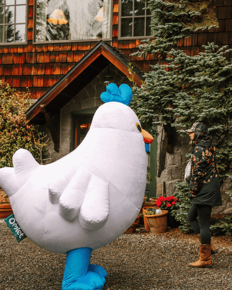 From the moment our guests drove into Bella Luna Farms just outside Seattle, they knew this wasn’t going to be your average farm visit. Why? Because Barbara, the blow-up Omlet chicken, was waiting to greet everyone in style.
